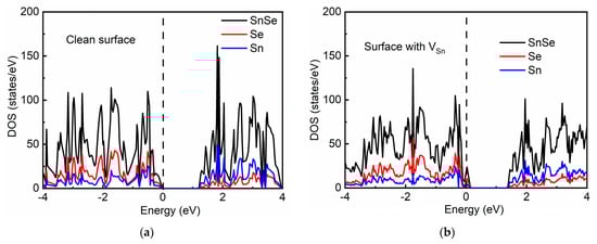 Density of states of two different surfaces. (a) Clean SnSe monolayer surface. (b) SnSe monolayer surface with one Sn defect.