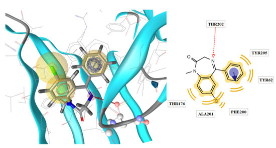 | Diazepam | −8.90 | 1 | Thr202 | Tyr62, Thr176, Phe200, Ala201, Tyr205 | Phe200 |