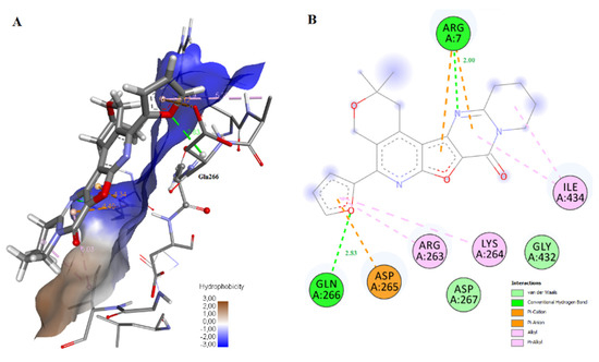 | 6k | −7.26 | - | - | Arg7, Arg431, Gly432, Gly433 | Asp265, Lys264 |