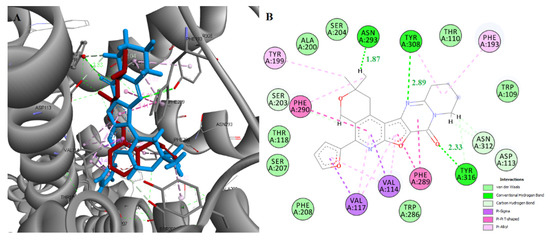 | 6k | −8.13 | 1 | Asn312 | Asp113, Ala200, Ser207, Phe108, Trp286, Tyr308 | Val114, Val117, Tyr199 |