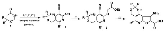 - Sirakanyan, S.N.; Spinelli, D.; Geronikaki, A.; Hovakimyan, A.A.; Noravyan, A.S. On the reaction of 2-[(4-cyano-5,6,7,8-tetrahydroisoquinolin-3-yl)oxy]acetamides with bases: 1-amino-6,7,8,9-tetrahydrofuro[2,3-c]isoquinoline-2-carboxamides and 3-amino-4-cyano-5,6,7,8-tetrahydroisoquinolines via a Smiles-type rearrangement. Tetrahedron 2015, 71, 3263–3272. [Google Scholar] [CrossRef]
