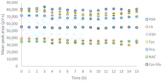 Finally, the derivatization reaction was quenched by adding 200 μL of 1 mol L−1 HCl to reach pH of 3. Other acids used to complete the derivatization of low-molecular-weight thiols include perchloric acid [41] or glacial acetic acid [53], however, their use in this procedure would precipitate HSA. The short-term stability of thiol–bimane adducts is not described in the literature, therefore it was tested during the research. For all the analytes, the thiol–bimane derivatives were stable in an acidic environment at room temperature over the time period studied (Figure 3). This means that the final solution kept at room temperature in the autosampler can be safely analyzed for up to 15 h which allows for long unattended runs.