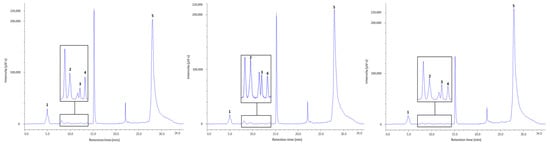 Since thiols do not contain a fluorophore in their structure that allows their direct fluorimetric detection, it is necessary to perform a derivatization reaction during the sample preparation step. For this purpose, we used mBBr, which reacts violently with thiols at alkaline pH and room temperature. The resulting highly fluorescent and stable thioethers can be easily detected, even at low analyte concentrations. The reagent itself also fluoresces and its peak is visible in the chromatogram along with the mBBr hydrolysis reaction products (Figure 2). Monobromobimane is readily photodegraded, so it is necessary to protect it from light and perform the reaction in the dark. The yield of the derivatization reaction was optimized with respect to pH (Figure S1), excess reagent (Figure S2), and time (Figure S3). The results indicate that the optimum reaction pH for the derivatization of endogenous plasma thiols with mBBr occurred at pH 9.5, and the reaction was completed after 10 min with 70-fold excess reagent in the dark and at room temperature. The obtained conditions are similar to those described earlier, where the reaction was carried out in N-ethylmorpholine at pH 9 for 10 min [41] or 20 min [54].