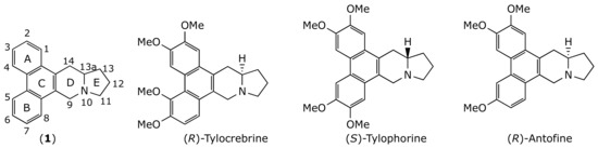 - Chemler, S.R. Phenanthroindolizidines and Phenanthroquinolizidines: Promising Alkaloids for Anti-Cancer Therapy. Curr. Bioact. Compd. 2009, 5, 2–19. [Google Scholar] [CrossRef] [PubMed]