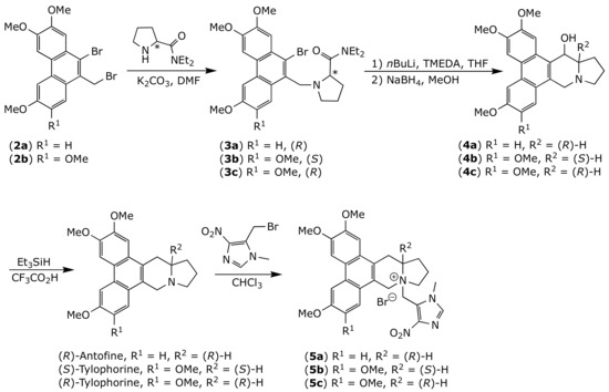Both enantiomers of tylophorine and (R)-antofine were obtained as previously described [45] with slight modification (Figure 3). Briefly, dibromides 2 were alkylated by the corresponding N,N-diethylpyrrolidine-2-carboxamide. Amides 3 were then treated with nBuLi and TMEDA, followed by sodium borohydride, to yield alcohols 4, which were finally reduced using triethylsilane and trifluoroacetic acid to give the desired alkaloids. The target quaternary ammonium salts 5a–c were successfully synthesized by reacting appropriate precursor alkaloids with 5-(bromomethyl)-1-methyl-4-nitro-1H-imidazole [43,46]. The prodrugs 5a–c obtained with reasonable yields (52–68%) after purification by silica gel.