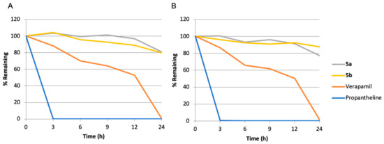 Stability of prodrugs 5a,b in mouse (A), and in human (B) plasma.