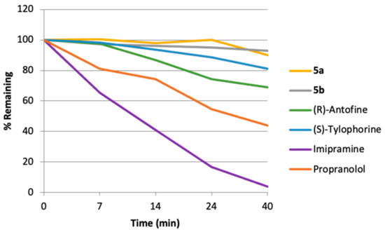 Similarly, consistent with their reduced lipophilicity the developed quaternary ammonium salts showed significantly higher metabolic stability than was observed for their parent alkaloids following incubation with mouse liver microsomes (Figure 5). The alkaloid half-lives were increased by three- to four-fold upon their transformation to the corresponding ammonium salts (Table 3). It is also noteworthy that less than 1% of compounds 5a or 5b was metabolized into the parent drug under these conditions.