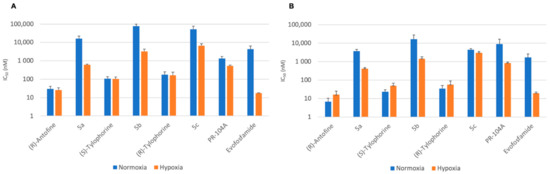 Cytotoxicity of compounds 5a–c and their parent alkaloids under normoxia and hypoxia against (A) HCT116 and (B) H460 (IC50, nM).