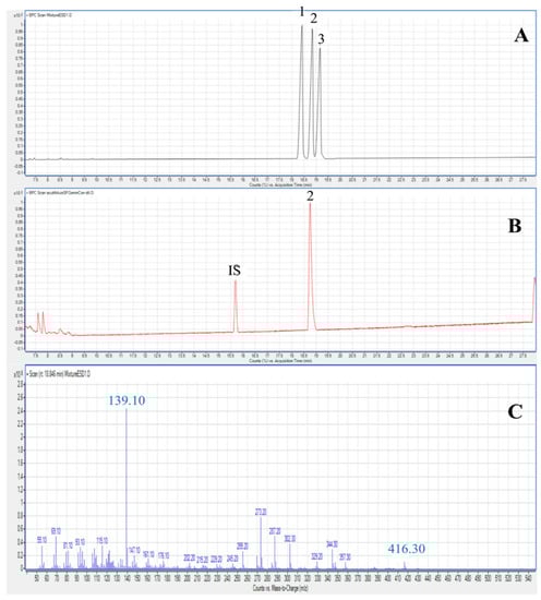 Chromatographic profile acquired by GC-MS of genin standards (A), hydrolyzed acid of saponin fraction of A. acutifolius organs (B) and mass spectra of sarsasapogenin (C). 1: Esmilagenin, 2: Sarsasapogenin, 3: Diosgenin, IS: Internal standard cholesterol.
