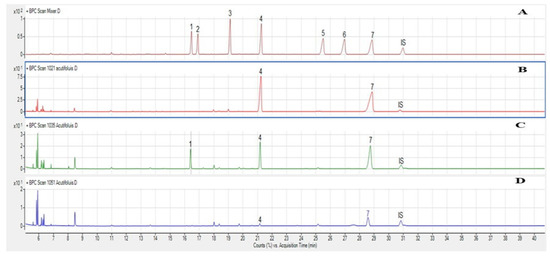 Chromatographic profile acquired by GC-MS of sugar standards (A), the major saponins detected in the hydrolyzed acid of A. acutifoius organs; (B), HTSAP-3, (C), HTSAP-6, (D), HTSAP-3 and ACSAP-1. 1: Rhamnose, 2: Fucose, 3: Arabinose, 4: Xylose, 5; Mannose, 6: Galactose, 7: Glucose, IS: Inter- standard; Inositol.