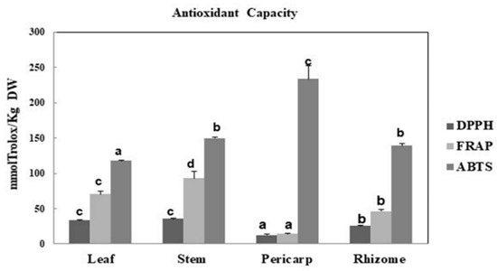 Antioxidant activities, expressed as mmol Trolox equivalent/Kg of dry weight in A. acutifolius leaf, stem, pericarp and rhizome ethanolic extracts, determined by DPPH, FRAP and ABTS assays. DPPH: DPPH radical scavenging activity; FRAP: Ferric reducing antioxidant power; ABTS: ABTS radical scavenging activity. Results correspond to the mean ± standard deviation of three replicates. Different letters (a–d) indicate that the values are significantly different (p < 0.05). The comparison is for different samples with the same method.