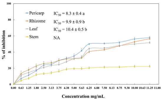 Pancreatic lipase inhibitory activity of leaf, stem, pericarp and rhizome ethanolic extracts of A. acutifolius. The pancreatic lipase inhibitory activity was expressed as IC50 μg/mL of dry weight. Results correspond to the mean ± standard deviation of three replicates IC50 values followed by different letters are statistically different. NA: no activity.