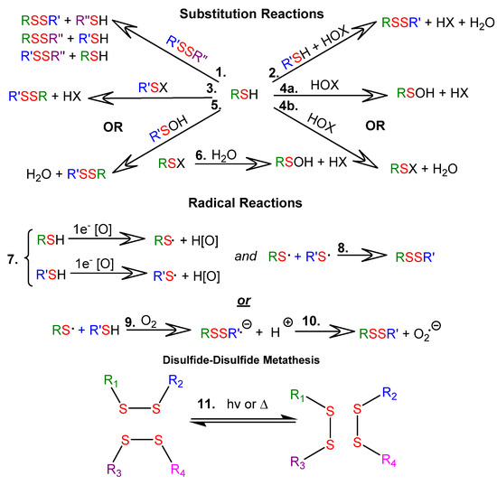 Reactions of thiols (RSH) and disulfides (RSSR): 1.1 SN2-mediated thiol-disulfide exchange; 1.2–1.6. Thiol oxidation with two-electron oxidants, where RSX is a sulfenyl halide, RSOH is a sulfenic acid, HOX is a halohydrin, and HOx is the reduced oxidizing agent; 1.7–1.10 Thiol oxidation with one-electron oxidizing agents; 1.11 disulfide-disulfide metathesis.