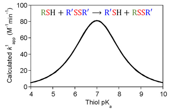 Calculated apparent rate constant for thiol-disulfide exchange in a solution at pH 7 as a function of reactant thiol pKa Reprinted with permission from [7]. Copyright Mary Ann Liebert, Inc.