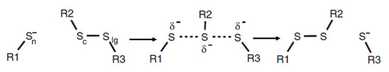 The orientation of a thiol and disulfide during thiol-disulfide exchange. Sn is the nucleophilic sulfur of the thiolate reactant; Sc and Slg are the central and leaving group sulfur atoms of the disulfide reactant Adapted with permission from [23]. Copyright (2013) Elsevier B.V.