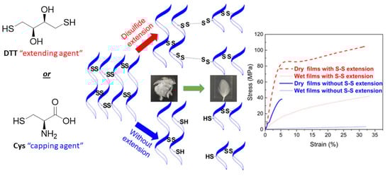 Mi et al. demonstrated that the secondary structures of waste keratinous materials can be restored after processing by crosslinking it with a dithiol, dithiothreitol (DTT), which functions as a “disulfide chain extender” [38]. In their work, the disulfide bonds of keratin were reduced, after which either a “disulfide capping agent” (Cys) or a “disulfide chain extender” (DTT) was added to regenerate disulfide bonds (Figure 7). Both wet and dry thin films fabricated from the disulfide chain extended keratin exhibited superior mechanical properties, relative to the capped keratin films.