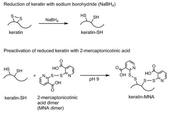 Other groups have adopted different approaches to investigate how to protect keratin by adding a thiomer capping agent. Thiol groups are an ideal target site for attachment of groups that can protect or restore hair, because hair contains between 7–20% Cys [37], most of which is present in the oxidized Cys2 form [39]. Leichner and coworkers [39] reduced keratin from human hair, generating a form with free Cys thiol groups (keratin-SH). They further derivatized keratin-SH with oxidized 2-mercaptonicotinic acid (MNA), generating a keratin-MNA derivative (Figure 8).