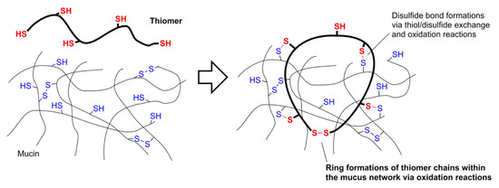 In a technical sense, gelation through disulfide bond formation is responsible for the mucoadhesion of the materials described in Section 3.1.2. However, mucoadhesive systems are generally governed by thiol-disulfide exchange (1 in Figure 1) and redox-based processes (2 through 10 in Figure 1) that result in the formation of new disulfide bonds between the mucoadhesive polymer and the Cys-rich mucin glycoproteins (as in Figure 9). Upon binding to a mucosal membrane, thiol- and disulfide-containing mucoadhesive materials undergo chemical reactions and gelation processes which are mechanistically different, and much more complicated than some of the redox-based examples that will be described below.