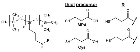 Partenhauser and coworkers attached thiol pendant groups to poly(dimethylsiloxane)-co-(3-aminopropyl)methylsiloxane by forming amide bonds between the carboxylic acid group of a thiol “ligand” precursors—either 3-mercaptopropionic acid (MPA) or Cys—and the primary amine groups of the poly(siloxane) (Figure 10; [72]).