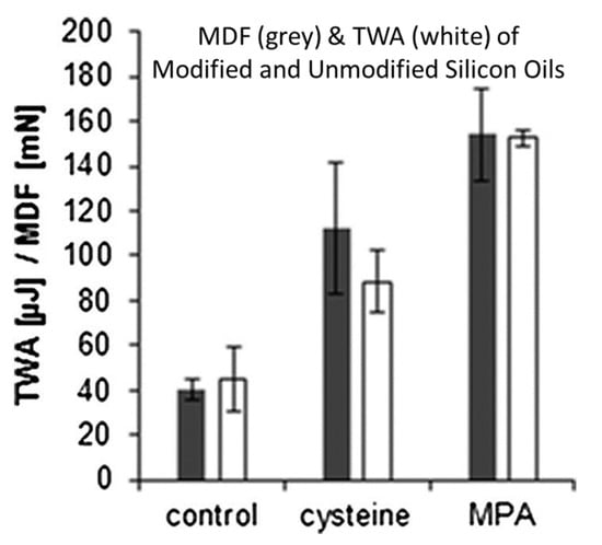 Mucoadhesion between a silicone oil and excised porcine mucosa was measured for silicone oil-MMA and silicone oil-Cys, as well as a non-thiolated silicone oil control (Figure 11). The maximum detachment force required to separate the mucosa from the silicone oil, as well as the total work of adhesion values demonstrate that the thiolated silicone oils bond more strongly to the mucosa than does the non-thiolated control.