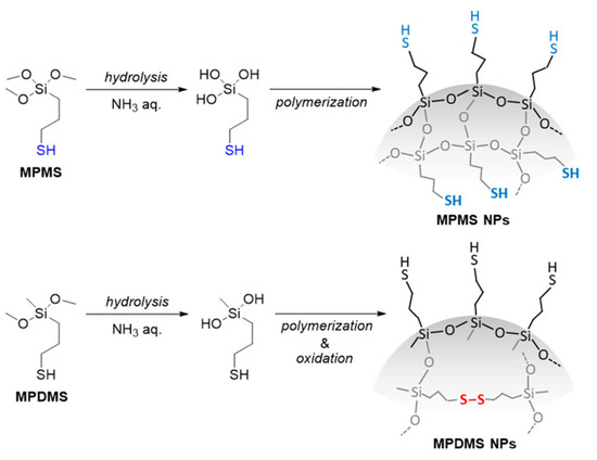 Structures of organosilica nanoparticles (ONPs) derived from (3-mercaptopropyl)trimethoxysilane (MPMS) and (3-mercaptopropyl)methyldimethoxysilane (MPDMS) precursors. Reprinted with permission from [81]. Copyright (2018) American Chemical Society.