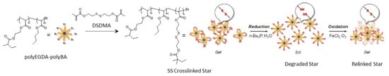 Kamada and coworkers used core-first atom transfer radical polymerization (ATRP) to synthesize star polymers whose arms contain disulfide crosslinks (SS crosslinked star) [83]. An initial ATRP generated a star polymer macroinitiator, which consisted of a crosslinked poly(ethylene glycol diacrylate) (polyEGDA) core surrounded by linear poly(n-butyl acrylate) (polyBA) arms (polyEGDA-polyBA). A second chain-extension ATRP was used to incorporate bis(2-methacryloyl-oxyethyl) disulfide (DSDMA) on the ends of the star arms, forming the SS crosslinked star (Figure 13). The disulfide bonds of DSDMA were scrambled upon their incorporation into the SS crosslinked star product. Results from dynamic mechanical analysis (DMA) indicate that this process resulted in inter- and intra-molecular disulfide crosslinks between arms.