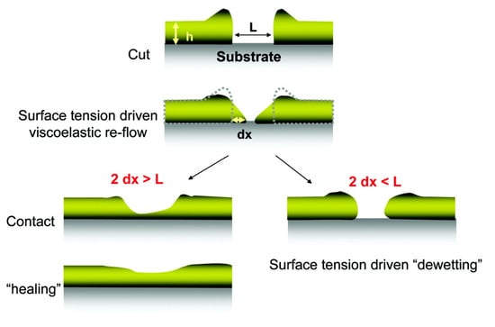 Yoon et al. studied the self-healing abilities of thin films fabricated from SS crosslinked polyEGDA-polyBA stars [84]. The mechanical properties and self-healing abilities were assessed for regenerated SS crosslinked films prepared by casting a dilute solution of reduced stars onto a silicon wafer. The kinetics of self-healing in the films was monitored after making cuts of various depths and widths using an AFM tip; the time-resolved tip-sample force vector was measured across the sample topology as the material healed at room temperature. Deep cuts that penetrated the film did not self-heal to the same extent as shallower, non-penetrating cuts. The cuts were considered “healed” when the Young’s modulus of the cut region matched that of the virgin material. Figure 14 shows the proposed self-healing mechanism.