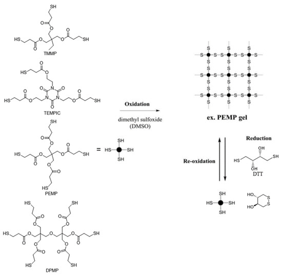 Reversible redox-triggered sol-to-gel transitions typically begin with the oxidation of a thiomer in solution to form disulfide linkages that gel the solution in situ. The thiomer is reacting with itself (either intermolecularly, or intramolecularly), as opposed to a substrate, as in the mucoadhesion examples described in Section 3.1.2. Often, the gelled networks can be reconverted to their sol phases by adding a reducing agent to break the crosslinks. This type of reaction can also be used to form more complicated networks from poly-thiolated molecules, oligomers, and/or polymers, as shown in Table 1.