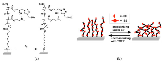- Mocny, P.; Klock, H.-A. Reversibly Cross-Linking Polymer Brushes Using Interchain Disulfide Bonds. Macromolecules 2020, 53, 731–740. [Google Scholar] [CrossRef]