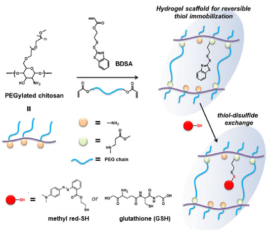 - Arslan, M. Fabrication and reversible disulfide functionalization of PEGylated chitosan-based hydrogels: Platforms for selective immobilization and release of thiol-containing molecules. Eur. Poly. J. 2020, 126, 109543. [Google Scholar] [CrossRef]