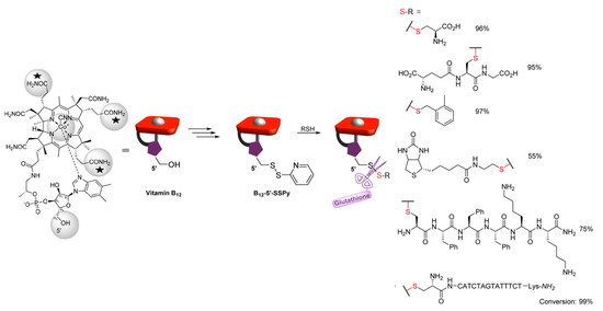 - Wierzba, A.; Mojciechowska, M.; Trylska, J.; Gryko, D. Vitamin B12 Suitably Tailored for Disulfide-Based Conjugation. Bioconjugate Chem. 2016, 27, 189–197. [Google Scholar] [CrossRef]