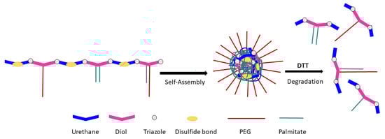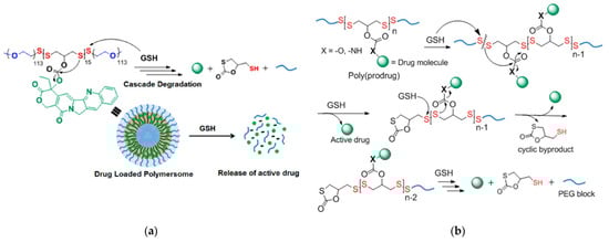 - Bej, R.; Ghosh, S. Glutathione Triggered Cascade Degradation of Amphiphilic Poly(disulfide)-Drug Conjugate and Targeted Release. Bioconjugate Chem. 2019, 30, 101–110. [Google Scholar] [CrossRef]