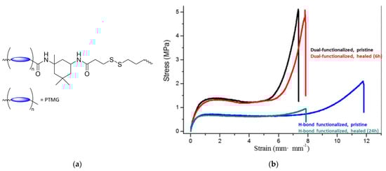 - Liu, M.; Zhong, J.; Li, Z.; Rong, J.; Yang, K.; Zhou, J.; Shen, L.; Gao, F.; Huang, X.; He, H. A high stiffness and self-healable polyurethane based on disulfide bonds and hydrogen bonding. Eur. Polym. J. 2020, 124, 109475. [Google Scholar] [CrossRef]
