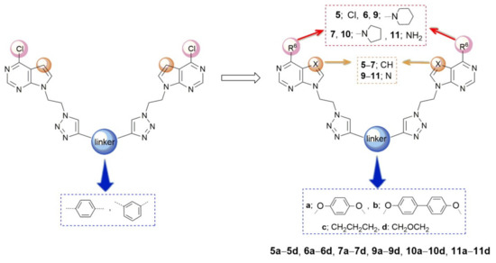 3.5. General Procedure for the Synthesis of bis- (5a–5d, 9a–9d, 10a–10d, 11a, 11d) and Mono- (5f, 5g, 9e–9g, 10f, 11e, 11g, 11h) Pyrrolo[2,3-d]pyrimidines and Purines
