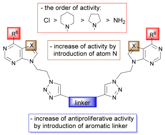 - Bistrović, A.; Harej, A.; Grbčić, P.; Sedić, M.; Kraljević Pavelić, S.; Cetina, M.; Raić-Malić, S. Synthesis and Anti-Proliferative Effects of Mono- and Bis-Purinomimetics Targeting Kinases. Int. J. Mol. Sci. 2017, 18, 2292. [Google Scholar] [CrossRef]
