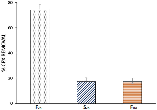 The differences in the adsorption properties of F and S were evaluated to determine the influences of the original material and activation process. Batch-type experiments were carried out where each adsorbent was placed in contact with a solution with 20 mg L−1 of CPX. As shown in Figure 1, FZn has the highest CPX removal efficiency at 74.1%, while SZn and FHA had similar removal efficiencies of 17.5% and 17.4%, respectively.