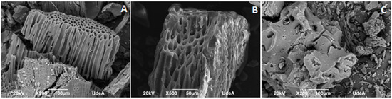 Scanning electron microscopy (SEM) micrographs of the adsorbent materials: (A) FZn (fiber activated with ZnCl2); (B) SZn (shell activated with ZnCl2); and (C) FHA (fiber activated with phosphoric acid).
