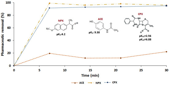 Changes to adsorption due to pH are affected by the structure of the antibiotic, which may improve or worsen the interaction between the adsorbate and adsorbent. The influence of the chemical structure of the pharmaceutical on the removal process was evaluated to clarify its interactions with the adsorbent. As shown in Figure 4, three pharmaceuticals with different chemical structures were tested for their removal by FZn, i.e., naproxen (NPX), acetaminophen (ACE), and cephalexin (CPX).