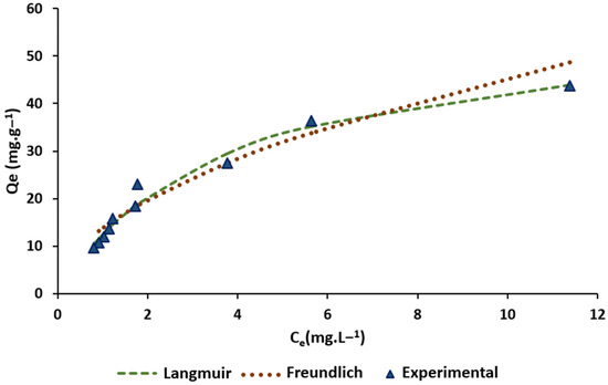 Adsorption isotherm models describe the distribution of the adsorbed contaminant on the adsorbent after the equilibrium state is reached. The information provided by these models is very important to understand the adsorption process. In this study, the Langmuir [35] and Freundlich [36] models were applied to analyze the experimental data. The Langmuir isotherm assumes monolayer adsorption and is widely used to quantify the maximum adsorption capacity (Qm):