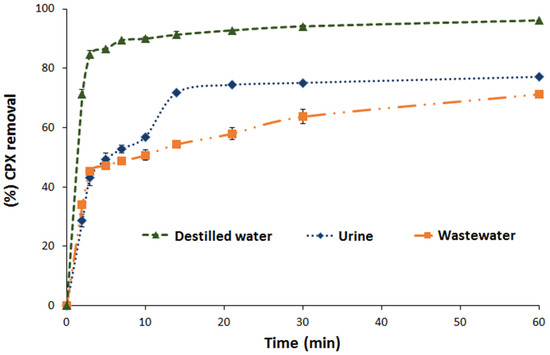 As expected, the removal efficiency decreased for both complex matrices. The tested matrices were characterized by a high inorganic salt content. Under working pH conditions and considering the PZC, the adsorbent was negatively charged and favored cation adsorption. Hence, cations such as Na+, K+, Ca2+, Mg2+, and CPX may have competed for the active sites of the adsorbent (i.e., deprotonated carboxylic acids) [12]. On the other hand, the differences between the wastewater and urine were because the former had more cations. Despite the reduced CPX adsorption in these complex matrices, a removal efficiency of around 70% is quite good for actual applications.