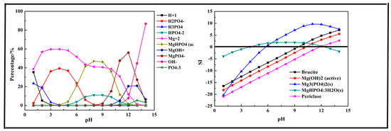 The results shown in Figure 4 indicate that the main species in the Mg-P-H2O system were H2PO4−, H3PO4, HPO42−, Mg2+, MgHPO4 (aq), MgOH+, MgPO4−, OH−, and PO43−. Phosphorus existing as H3PO4 first transformed into H2PO4− at pH < 7 and then transformed into MgHPO4 (aq) and HPO42− at pH = 4–12, owing to the existence of Mg2+. As pH value increased to 9, MgPO4− was the main form of phosphorus and up to 56.1% at pH = 12. The main products of the reaction were predicted as brucite (Mg(OH)2), Mg(OH)2, Mg3(PO4)2, MgHPO4·3H2O, and Periclase (MgO). The removal of phosphorus with Mg2+ should be conducted at pH > 6 and especially at pH > 10 as there was no precipitation generated at pH < 5 and only Mg3(PO4)2, MgHPO4·3H2O generated after pH = 5. After pH = 11, almost all the predicted products generated except MgHPO4·3H2O, which dissolved again. The optimal pH ranged from 7 to 14.