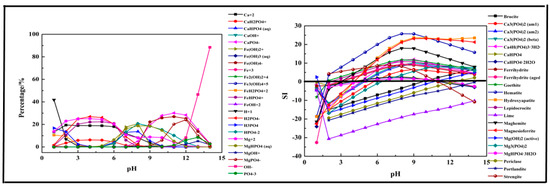 The results shown in Figure 8 indicate that the main species in the Fe-Ca-Mg-P system could be divided into three sections. At pH = 1–6, CaH2PO4+, H2PO4−, Mg2+, FeHPO4+, and Ca2+ were the main species in the solution. As pH value increased, above ions transformed into MgHPO4 (aq) (pH = 5–13), CaHPO4 (aq) (pH = 5–10), HPO42− (5–13), CaPO4− (pH = 8–14), Fe(OH)2+ (pH = 5–12), and MgPO4− (pH = 9–14). The first precipitation containing phosphorus was Strengite after pH > 2, while it occurred at pH = 0 in a single-salt system and two-salts system. Then other precipitations formed continually. The composition in the three salts system was more complex, and the precipitation was no more stable than the single salt system.