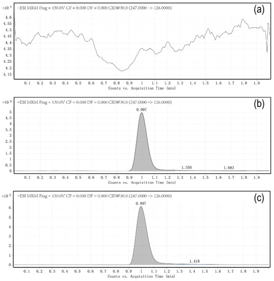 Optimal mobile phase combination could highly improve peak shapes and retention behaviours of the compounds in the LC system. Methanol and acetonitrile were selected as the most common dissolution media based on their effective solubility [22]. In previous studies, the use of pure methanol as the dissolution agent caused the column to produce two separate peaks, and the target compound exhibited poor retention behaviour. Similarly, pure acetonitrile as the dissolution agent resulted in bad peak shape and low sensitivity. In this study, it has been proven that the effect was the best when 0.2% acetic acid and 5 mM/L ammonium acetate were added to ultra-pure water. Figure 2 shows representative chromatograms of fludioxonil in (a) samples of untreated cherries, (b) samples of fludioxonil standard in the cherry matrix, and (c) samples of cherries soaked in fludioxonil. Among them, sample (a) was cherries soaked in clear water after harvest for control treatment, and Sample (b) added fludioxonil standard to the blank cherry sample artificially. The purpose was to eliminate the interference of the matrix effect on detection and to carry out an additive recovery experiment. Sample (c) was cherries soaked with the fungicide fludioxonil after harvest. As Figure 2 shows, the retention time of fludioxonil was 1 min. There were no apparent endogenous interference peaks. The target analytes matched the retention time of the standard sample exactly, and it did not co-elute with any other peaks.