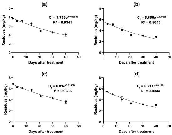 Figure 3 shows the curve of dissipation of fludioxonil with time in cherries from (a) Anhui, (b) Beijing, (c) Henan, and (d) Shandong. The curve indicates that the dissipation of fludioxonil in cherries followed first order kinetics. The half-lives of fludioxonil in cherries were 41 days, 33.7 days, 44.7 days and 35 days, and our results were different from the finding reported by Zhang that the half-lives of fludioxonil were 6.2–7.2 days in grapes and 6–12.1 days in soil [23]. Compared with our indoor low-temperature and light-proof environment, after applying pesticides in grape fields, the effects of temperature, light, and precipitation may accelerate the degradation process. Volatilisation, wash-off, plant growth, photolysis, pesticide physicochemical properties, chemical decomposition, and metabolism due to oxidation and hydroxylation, are all factors that play important roles in the limitation of pesticide residues in plants [46,47]. In addition, the activity of microorganisms in the soil and the adsorption of organic matter can also help degrade residual pesticides [48]. This can also explain why the residual level and half-life in our experimental results are higher than the previous research results of Zhang et al.