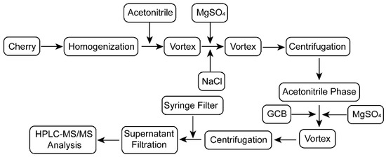 In the QuEChERS method, the pits, stems and damaged fruits in the cherry samples were removed, and the pulp was chopped and homogenized. Cherry samples, 10 g each, were placed in 50 mL polypropylene centrifuge tubes and homogenized after adding 10 mL of acetonitrile. The samples were shaken vigorously by vortexer for 1 min until uniform, after which 4 g MgSO4 and 1 g NaCl was added, and the sample was again shaken vigorously by the vortexer for 1 min. The samples were centrifuged at a speed of 3000 rpm for 3 min. The 1.5 mL supernatant aliquot was transferred into a 3 mL centrifuge tube without disturbing the sediment, and the clean-up reagents of anhydrous MgSO4 (100 mg) and GCB (10 mg) were added. The mixture was vortexed for one min and then centrifuged at 10,000 rpm for 3 min. The clear supernatant extraction was filtered into an autosampler vial through a 0.22 μm syringe filter, and it was then analyzed via HPLC-MS/MS. The process of extraction and purification are shown in Figure 4.