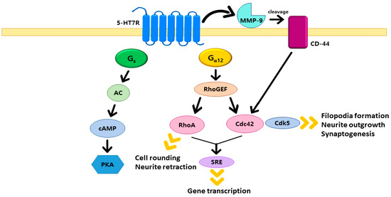 Bijata and co-workers reported that synaptic remodeling is associated with extracellular matrix (ECM) remodeling, which is uncovered through a signaling pathway including the 5-HT7R, matrix metalloproteinase 9 (MMP-9), the hyaluronan receptor CD44, and Cdc42 [30]. The authors discovered that stimulation of 5-HT7R by 5-CT and application of auto-activating MMP-9 (aaMMP-9) significantly increased the length of dendritic spines while no spine elongation was observed in cultures from MMP-9 KO and 5-HT7R KO mice. The researchers also found that the activation of 5-HT7R increased the activity of MMP-9, which is abolished by pretreatment of SB269970. These data suggest the involvement of 5-HT7R/MMP-9 signaling in dendritic spine alteration. To confirm the link between ECM and the above signaling, the authors focused on CD44, a receptor for a major ECM component, which connects the ECM to the intracellular signaling pathway related to the activation of the Cdc42. Silencing of CD44 leads to abrogation of 5-CT-induced increase in dendritic spines, and direct interaction and co-localization between 5-HT7R and CD44 have been identified with a fluorescence resonance energy transfer (FRET) based approach. Interestingly, the use of the Cdc42 inhibitor ZCL278, as well as CD44 KO, leads to suppression of dendritic spine elongation caused by the stimulation of 5-HT7R or treatment of aaMMP-9. These results suggest that an interaction between 5-HT7R and CD44 plays an important role in regulating Cdc42 activity concerning the spine morphology. In addition to these observations, the authors identified that MMP-9 can cleave the extracellular domain of CD44 in neurons, which is accomplished by the stimulation of 5-HT7R. Taken together, activated 5-HT7R results in the activation of MMP-9, which cleaves the extracellular domain of CD44, and then this cleavage, in turn, promotes morphological changes elicited 5-HT7R/Cdc42 signaling pathway (Figure 1).