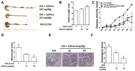 Saffron reduced the severity of DSS-induced colitis in mice. Mice were orally gavaged with saffron (10 mg/Kg and 20 mg/Kg) or the vehicle for 4 days before the administration of 2.5% DSS in their drinking water and continued for 7 days along with the DSS. Inflammation was assessed by (A) macroscopic appearance of the colon tissue; (B) colon length; (C) the disease activity index; (D) the macroscopic score; (E) representative micrographs of H&E-stained colon cross-sections on day 7 post-DSS, bar = 100 µM; and (F) the histological score. Data represent the mean ± SEM (n = 4/group). * p < 0.05, compared to the vehicle-treated mice.