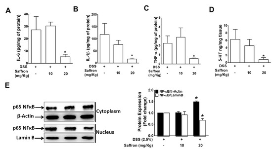 Pre-treatment with saffron inhibited the DSS-induced secretion of pro-inflammatory cytokines and the serotonin level in colon tissue. The supernatants from the homogenized colon tissue were analyzed for (A) IL-6, (B) IL-1β, (C) TNF-α, and (D) Serotonin (5-HT). Data represent the mean ± SEM (n = 4/group). * p < 0.05, compared to the vehicle-treated mice. (E) Cytoplasmic and nuclear protein extracted from colon tissues were analyzed for NF-κB. Representative blots of the cytoplasmic and nuclear NF-κB from the colon tissue of three random mice from each group. The bar graph represents the mean ± SEM. * p < 0.05, compared to the vehicle-treated mice.