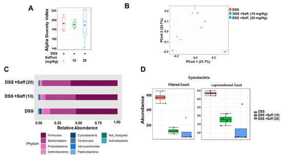 Microbial composition analysis in the cecal samples of saffron pre-treated and untreated mice challenged with DSS. The cecal content of mice were subjected to 16S rRNA partial sequencing profiling analysis and the figure represents (A) the alpha diversity of the three group of mice using the Chao1 index. (B) PCoA of the Bray–Curtis dissimilarity, showing distinct microbiota in each group of mice. (C) Taxonomic summaries at the phylum level. (D) Abundance of Cyanobacteria in the saffron-treated and untreated groups (n = 4/group).