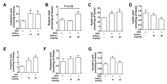 Saffron prevented depletion of the SCFA concentrations in fecal samples of DSS-treated mice. Fecal samples of mice were analyzed for determining the concentration of (A) isobutyric acid, (B) butyric acid, (C) acetic acid, (D) lactic acid, (E) propionic acid, (F) pentanoic acid, and (G) isovaleric acid. Data represent the mean ± SEM (n = 4/group). * p < 0.05, compared to the vehicle-treated mice fecal sample.